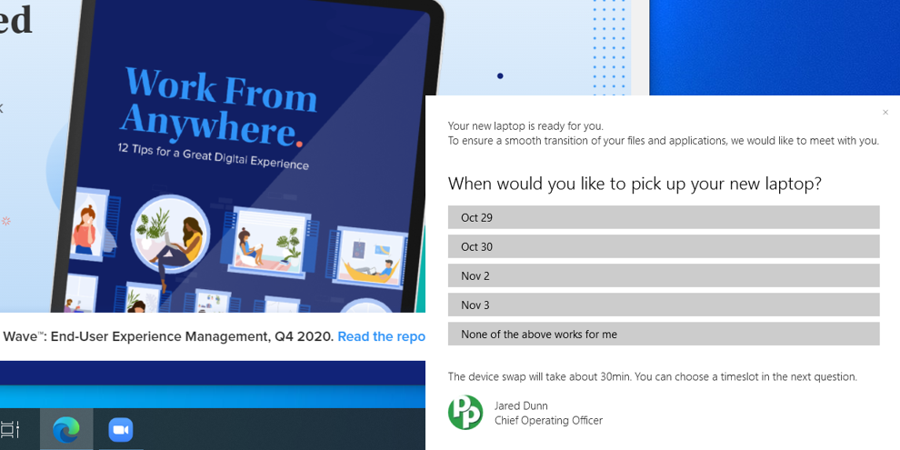 Most IT departments make the hand-over process for new laptops and hardware unnecessarily difficult. They either leave employees hanging by shipping out packages that may take weeks to arrive or they can play ‘message-tag’ trying to coordinate an appropriate time for their employees to come to the office (easier said than done during the pandemic).