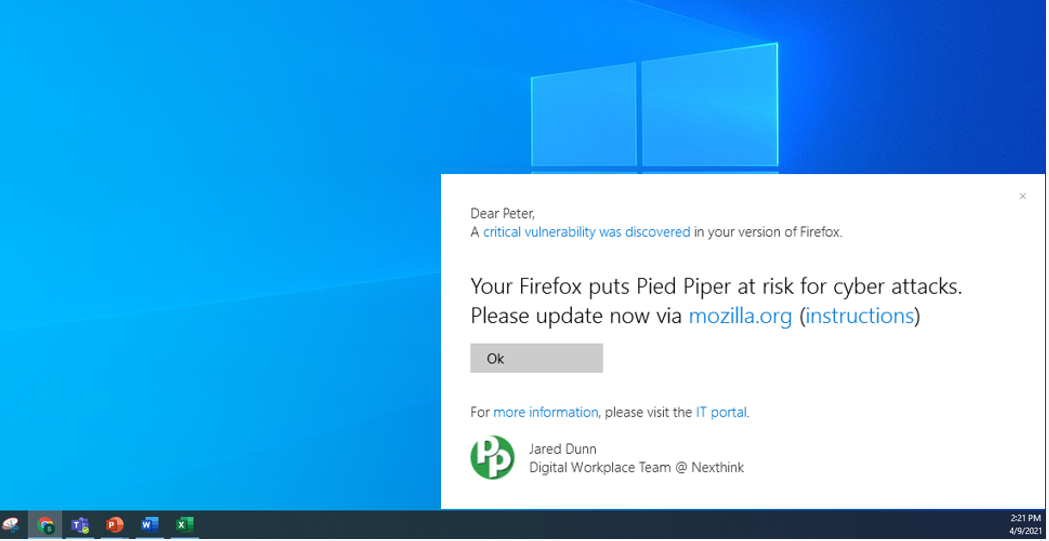 For example, here’s a real vulnerability that occurred with Mozilla Firefox in the fall of 2020. With the right experience tools, IT can pivot quickly and alert employees to update to a new version. This subtle action can save teams the headache of having to respond to tickets from employees or having to repair any damage done from a cyber breach.