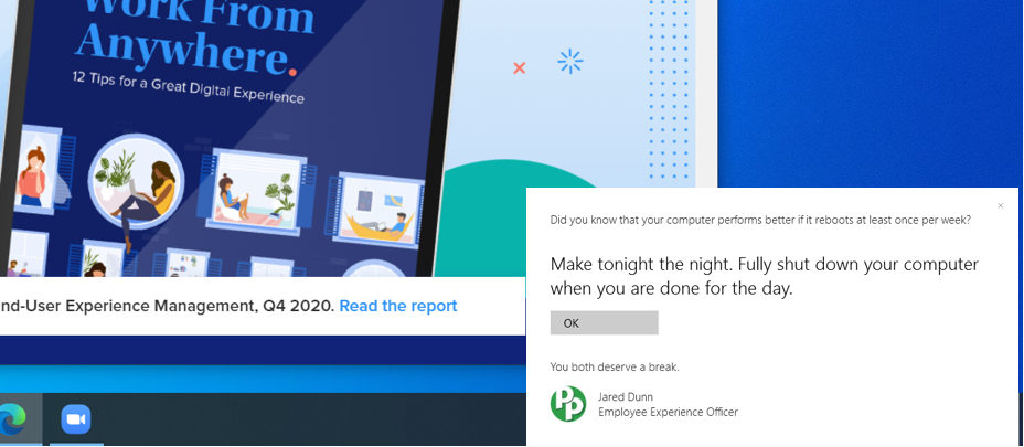 Likewise, digital security scenarios for in-office and remote workers should be met with the same approach. If I log into my work computer from home, and a vulnerability is detected in say, my web browser, IT should be the one to proactively contact me with simple, efficient instructions to protect my digital workspace.