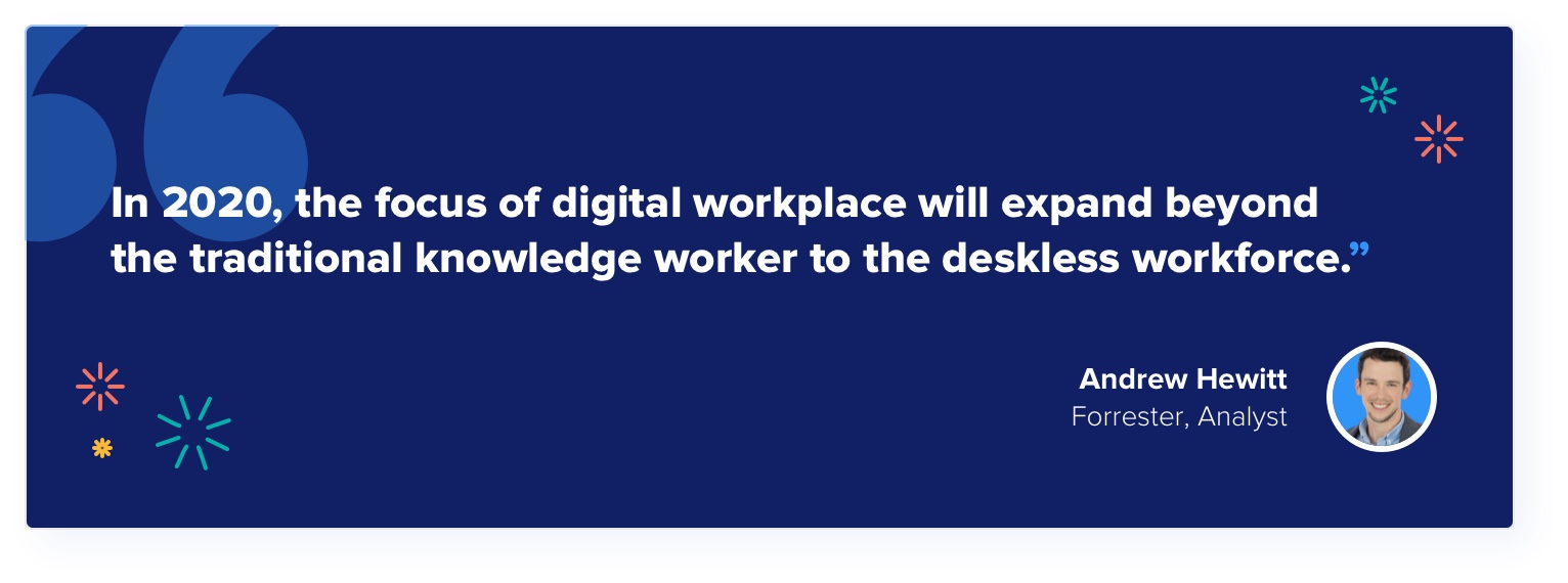 In 2020, the focus of digital workplace will expand beyond the traditional knowledge worker to the deskless workforce. This will include both customer-facing and non-customer facing roles in industries such as retail, manufacturing, healthcare, and hospitality. Companies will increasingly realize that creating engaging digital experiences for these groups is critical to unlocking higher retention in these attrition-prone industries.