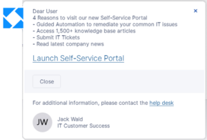 To fuel employee adoption and save their project, the IT team sent a Nexthink Engage pop-up notification to all employees announcing the self-service portal and explaining the benefits. The campaign provided a 1-click link to access the portal directly so employees could see for themselves.