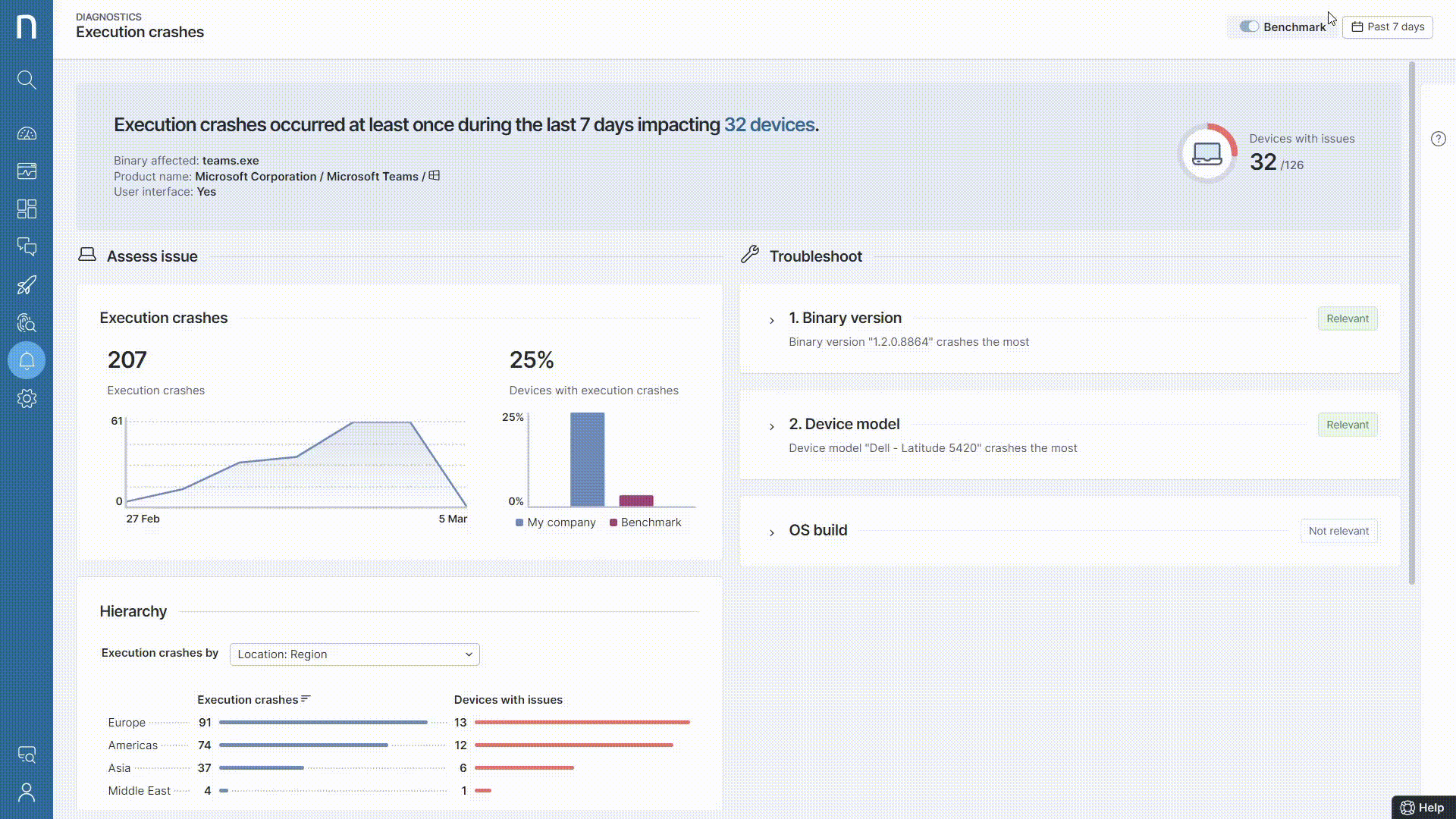 Let’s take the same example from above. Nexthink equips IT with automated correlations to quickly understand which variable(s) are impacting the poor stability with MS Teams. In a single click, IT can retrieve all devices experiencing the same stability issues due to a non-compliant version of Teams, a task which would have otherwise taken forever to identify.