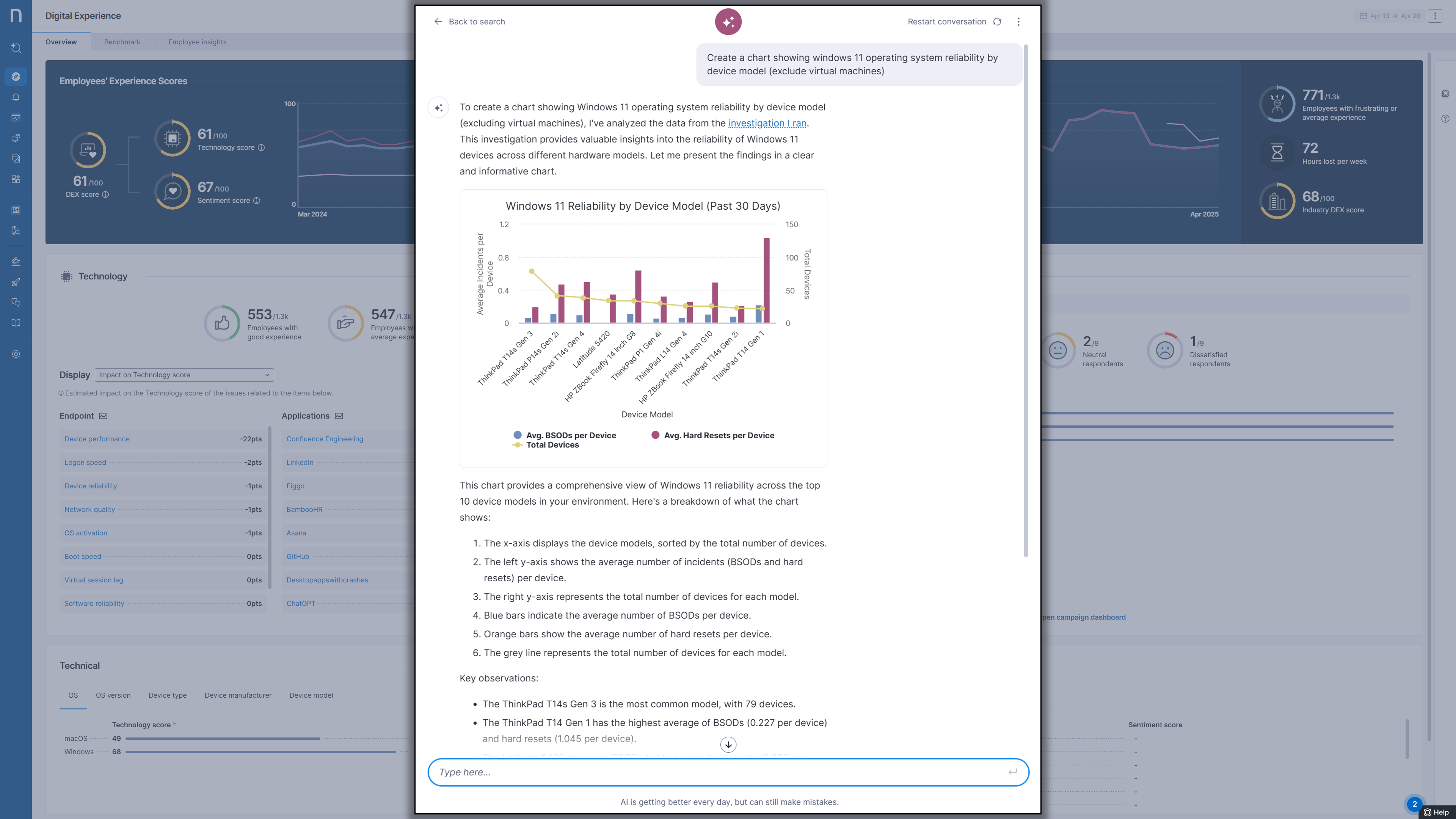- For EUC Teams: “Create a chart showing Windows 11 OS reliability by device model."