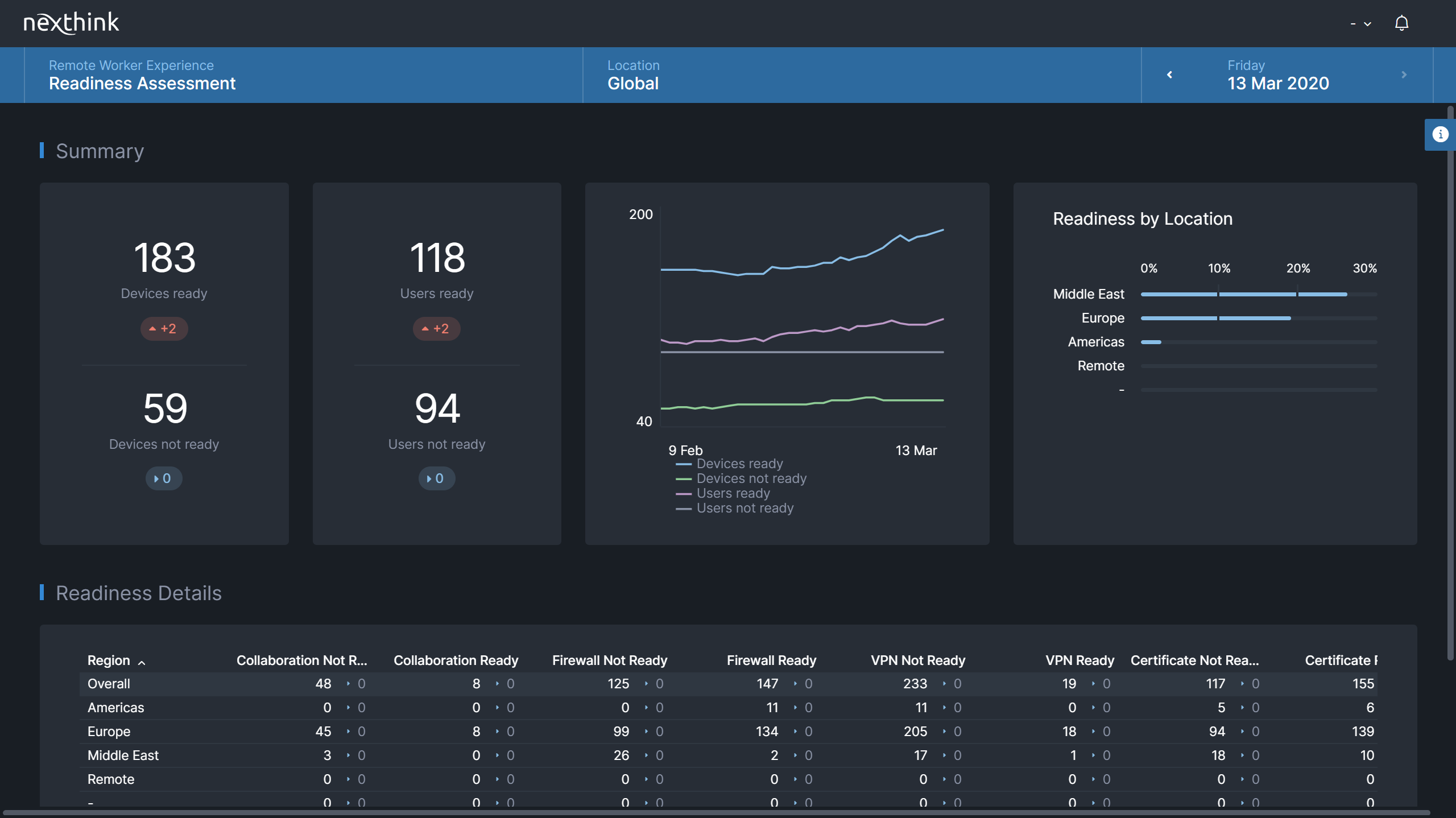 - The agency’s employees had to leave the office on such short notice that IT didn’t have the capacity to run a proper readiness assessment using their existing ITSM tools. With Nexthink’s dashboards, their IT department was able to immediately diagnose whether their employees’ devices (laptop and desktop), and their VPNs and Firewalls were ready to move offsite.