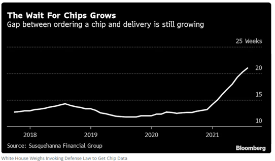 This chart by Bloomberg and the Susquehanna Financial Group reflects the gap between putting in a semiconductor order and taking delivery — a process which extended for the ninth month in a row to an average of 21.7 weeks in September, the longest since the firm began tracking the data in 2017.
