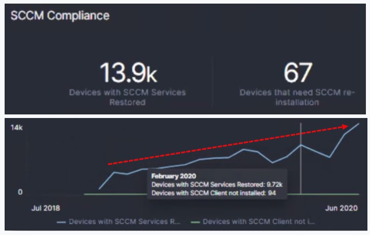 To further investigate, the IT team scripted and deployed a remote action that reported every device where SCCM services had stopped. Their next move was to deploy a second automated remote action over a one-month period that restarted and restored each devices’ SCCM services.