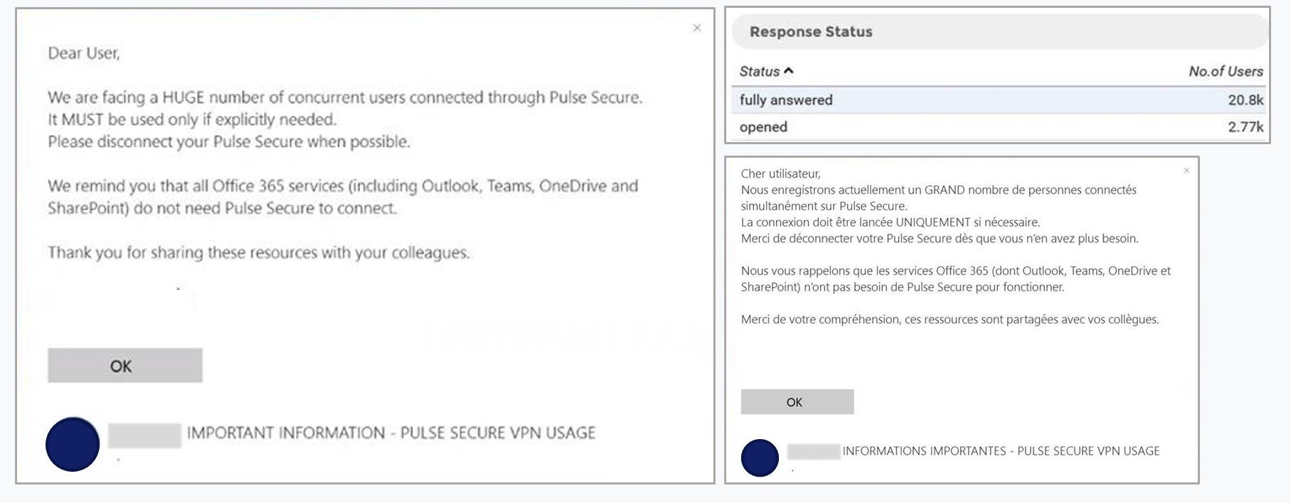 Thanks to the campaign’s contextual and timely aspects, positive outcomes were clear in just a few hours. Over 23,500 employees received the campaign with a 90% response rate. The VPN load was quickly reduced and overall VPN connectivity and performance increased, reducing network usage by 75%. Employees could access their critical services once again, saving thousands of hours of both IT and employee productivity, as well as avoiding any related operational costs.
