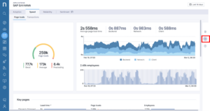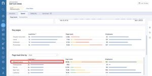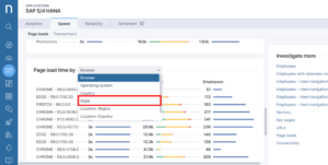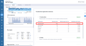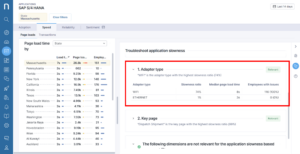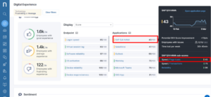 When you hover over the application, a dialog appears, showing you the score for business-critical application “SAP S/4 HANA.” Here, we can see that the current score is poor for employees with frustrating digital experience. In the same view, we can see that the reason for this poor performance is high page loads.
