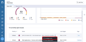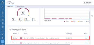 Here, we can quickly see that there is a critical alert for the SaaS application SAP S/4 HANA due to slow transaction duration.