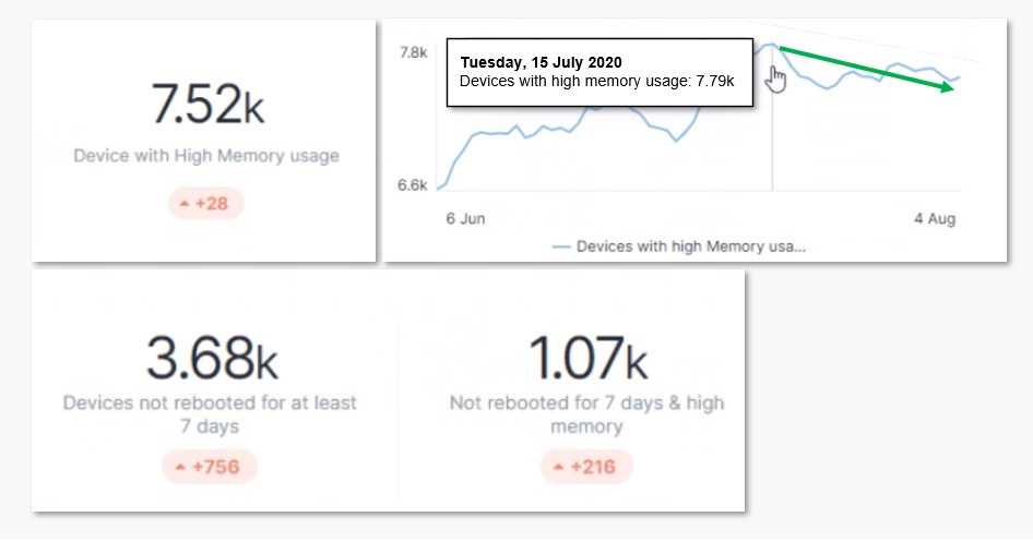 This global mining company noticed a sudden drop in its overall DEX Score, attributed to a drop in device performance. A quick analysis showed that over 7,000 devices were experiencing high memory usage. Further investigation revealed some interesting facts: about 50% of those devices had not rebooted in more than 7 days, and 15% had a direct correlation between this lack of reboot and high memory usage. These devices were not receiving critical OS updates, which resulted in performance issues.