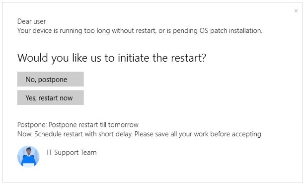 To resolve this issue and improve their employees’ device experience, the customer deployed a highly targeted self-help campaign to those employees that were experiencing high memory usage and still needed to reboot their devices. This campaign not only brought the issue to each user’s attention but also allowed the employee to restart the device themselves through an automated action.