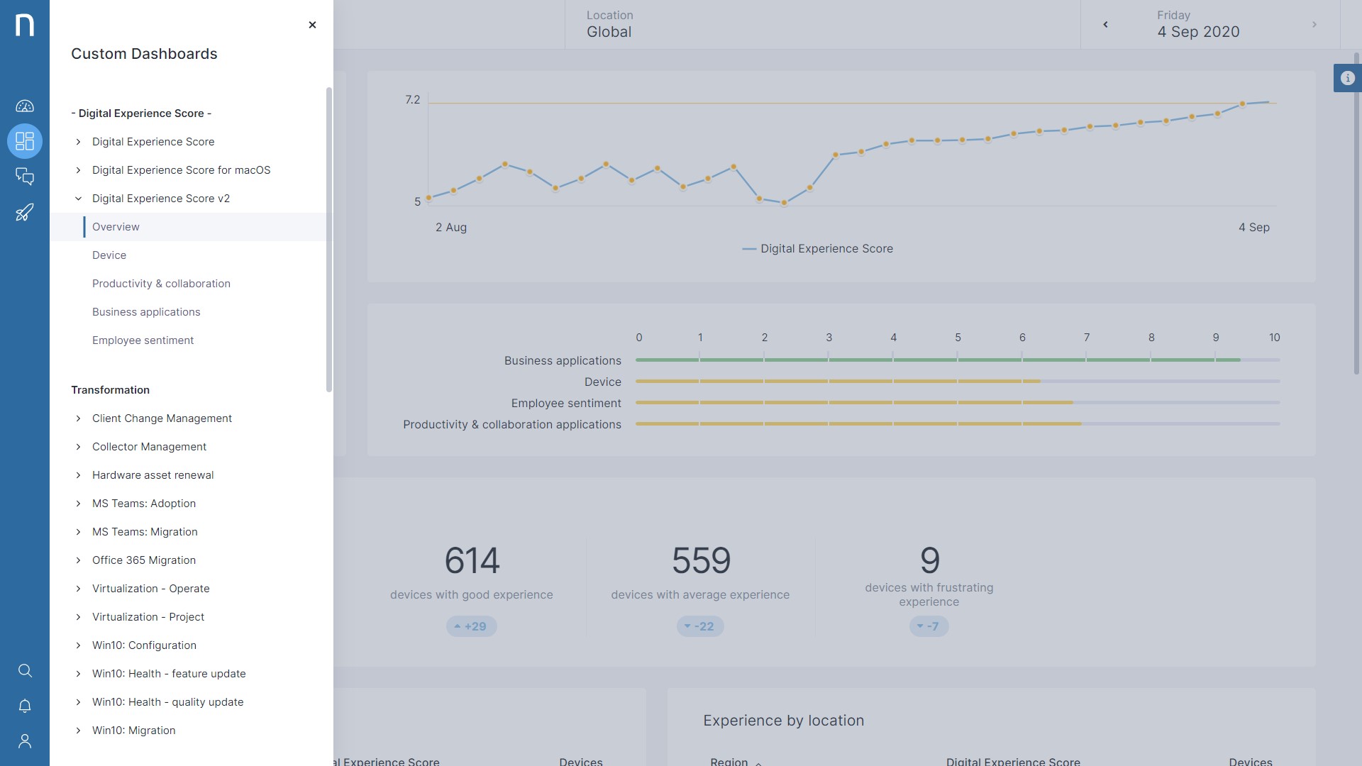 We have now introduced four new dashboards supporting additional drill-down into different aspects of the overall DEX Score. You can navigate separately across Device, Productivity and Collaboration, Business Applications and Employee Sentiment views – allowing you to better prioritize critical areas of improvement and initiate even more focussed remediation playbook actions.