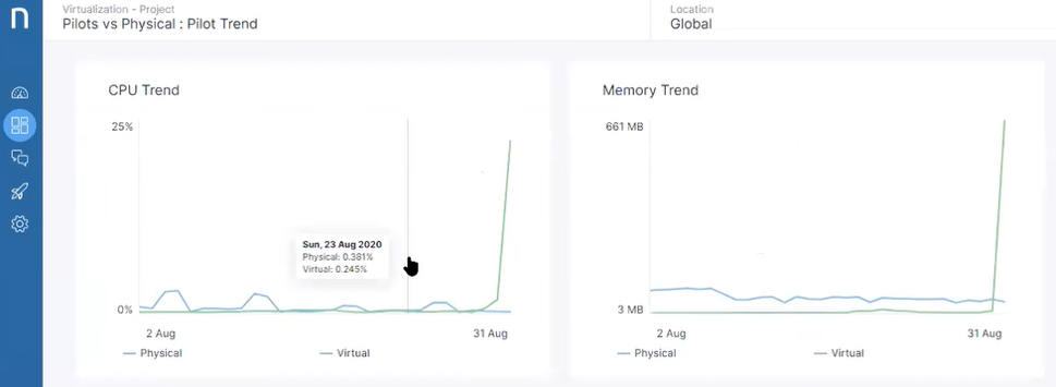 In the following example, we see that the CPU and memory usage of the virtual desktops just spiked, indicating an issue that needs to be addressed.