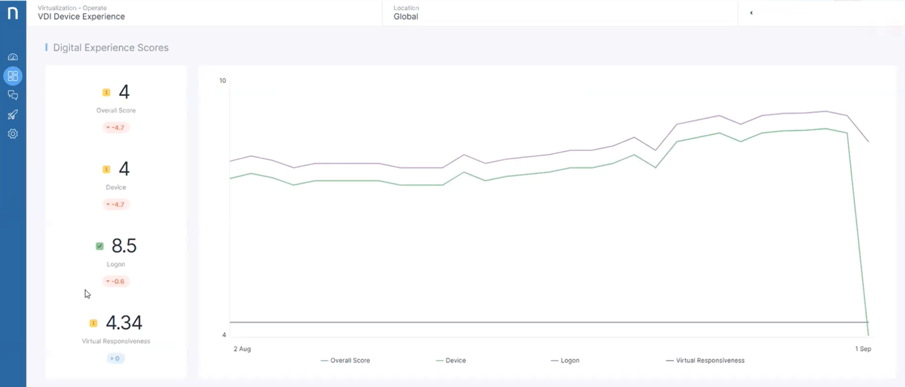 When virtual desktop users do encounter problems, Nexthink can help you identify if the problems are likely related to the network or virtual infrastructure. In the following example, we see a sudden drop in the Digital Experience Score for those using VDI devices.