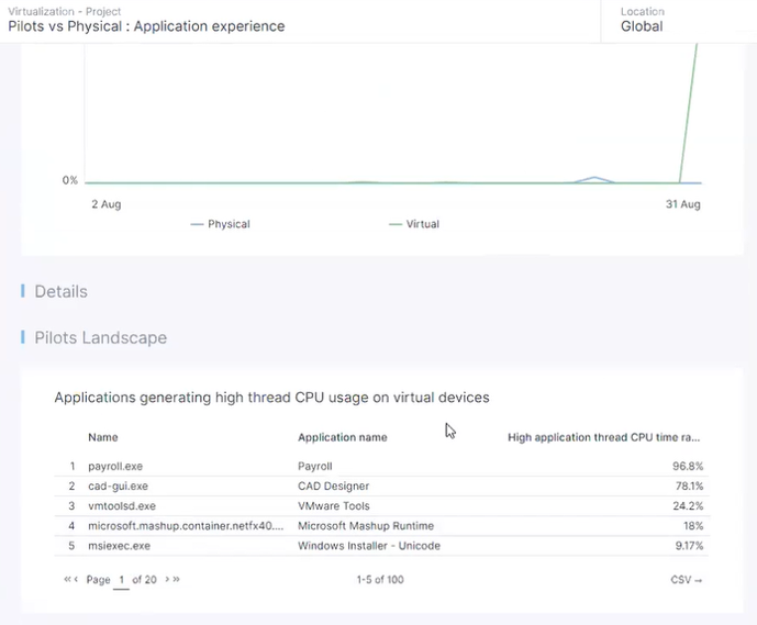 Nexthink also identifies which applications on those virtual desktops are using the most CPU resource. In this case, a payroll application is the top cause, as shown below. When a new version of the application was rolled out to the virtual desktops, the team had forgotten to disable graphical acceleration, leading to excessive CPU usage—a problem that can be easily solved.