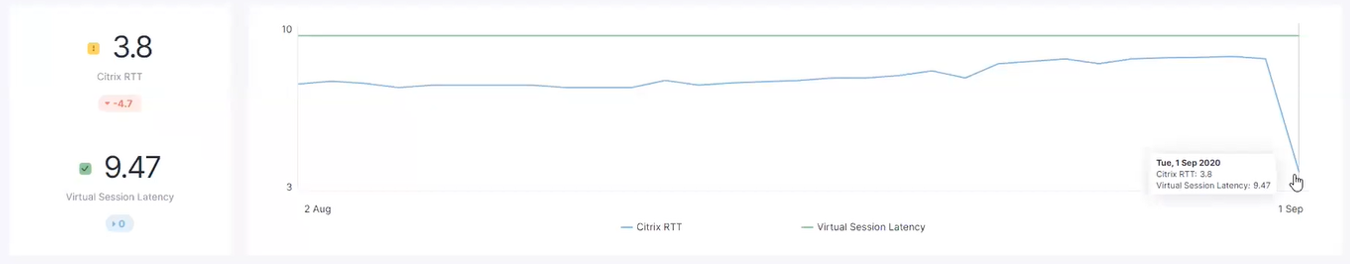 Looking further, we see that the Citrix RTT just fell dramatically, but the network latency was unchanged, suggesting a problem with the virtual machines, not the network.
