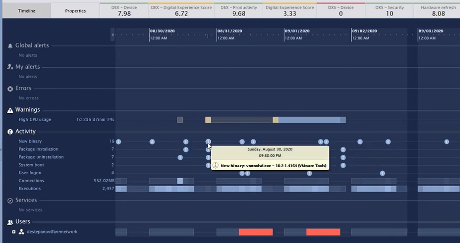 Finally, the event-level data for one of the affected virtual desktops shows that a new binary was installed right before the virtual desktop’s CPU usage spiked and the user’s experience score fell into the red.