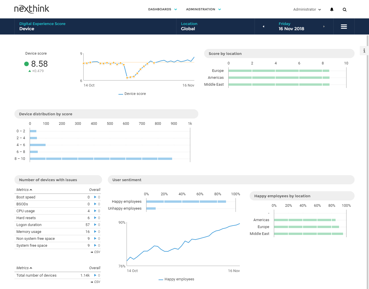 Using the Nexthink platform, our customers are bridging these two competing interests. Their IT support teams use Nexthink to analyze what tools (approved or non-approved) sit on their employees’ devices, and how those users experience their respective digital work environments (taken specifically from our onscreen employee feedback campaigns and comprehensive digital experience scoring dashboards).