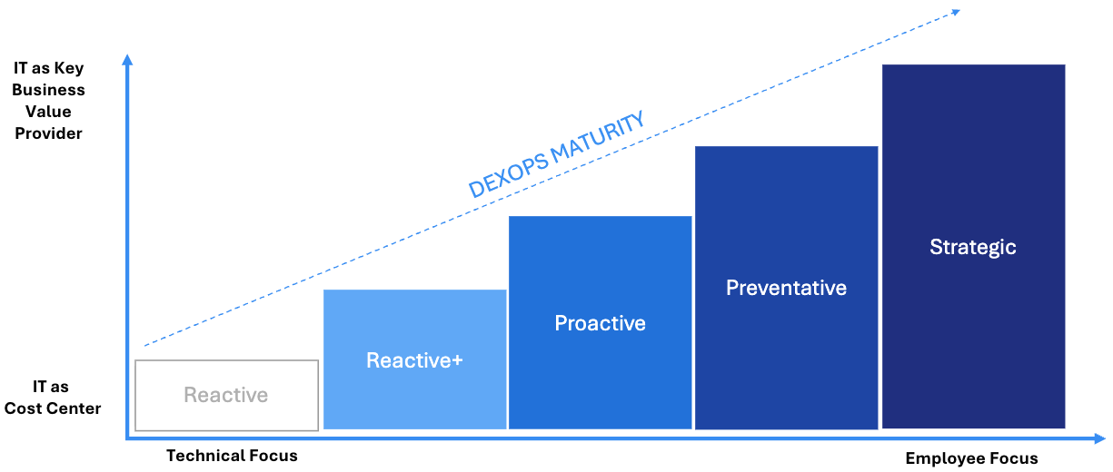 The DEX Ops maturity model defines four stages that move IT from firefighting to strategic enablement.