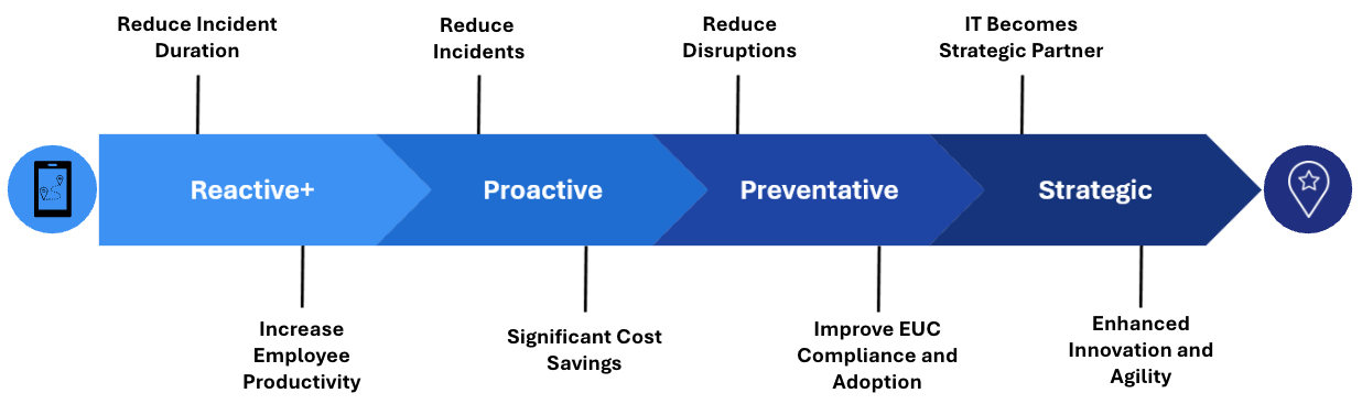 Most organizations begin in a reactive state, focused on troubleshooting and firefighting. DEX Ops introduces a structured path toward operational maturity.