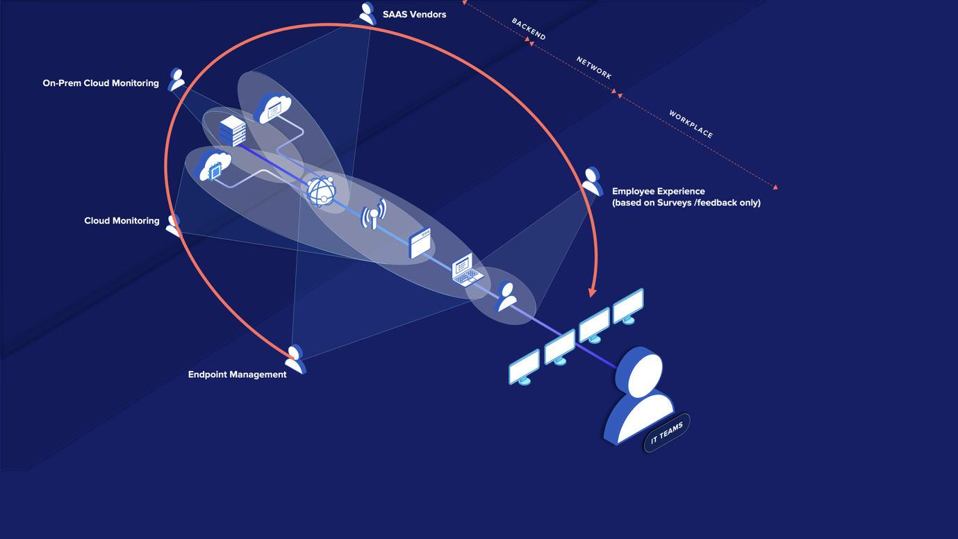 - Endpunktmanagementtools konfigurieren Geräte und installieren neue Software, bieten jedoch nicht die nötigen Einblicke zu Herausforderungen für Mitarbeiter bezüglich der Konnektivität und des Anwendungszugriffs.