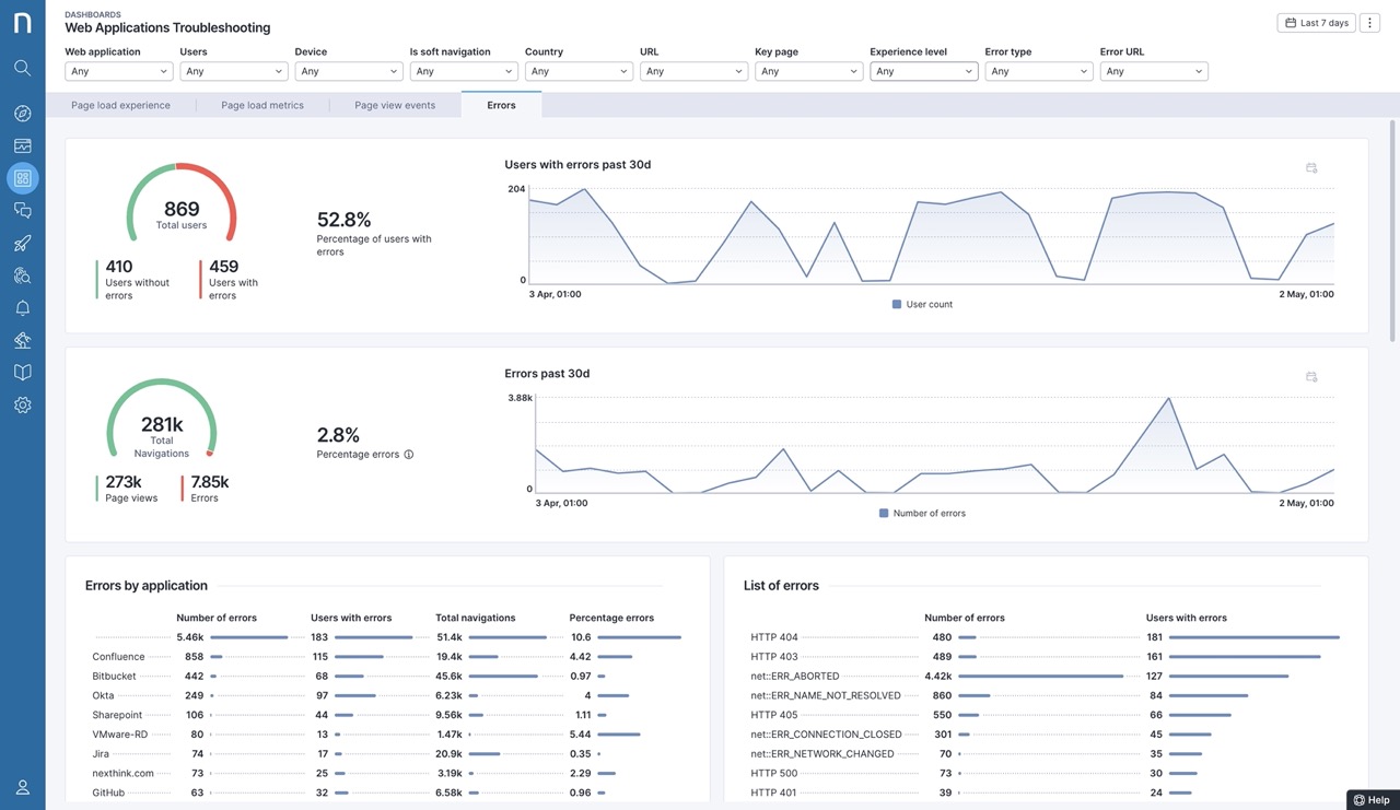 Shortly following the 2023.4 update, we will make available a new advanced troubleshooting library pack for Application Experience. This will allow web errors to be more quickly and accurately analyzed across multiple dimensions, with filtering on devices, users, and urls in a new dashboard.
