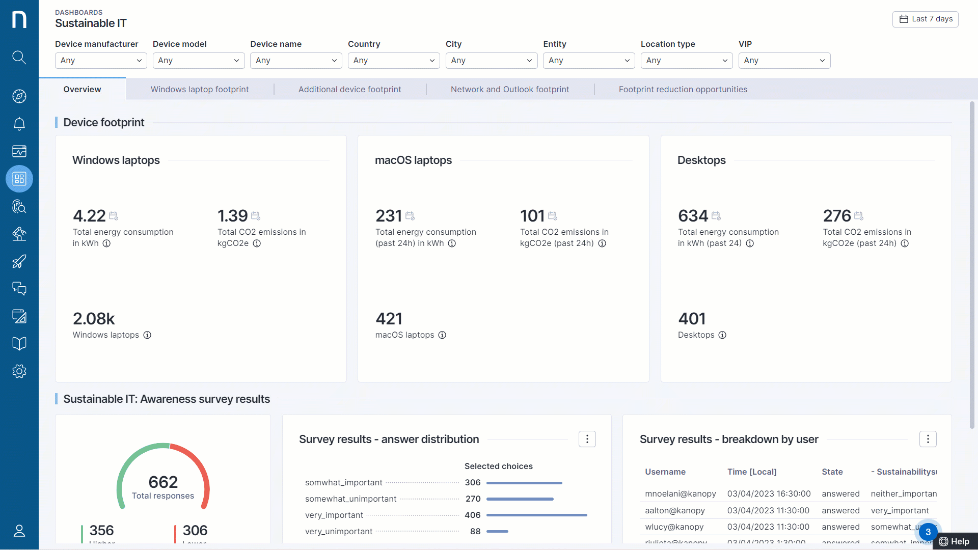 This tab gives you a high-level overview of your device’s overall energy consumption, associated CO2 emissions, and the Sustainable IT: Awareness Survey campaign results. This information helps to determine, if you want to quickly report on your devices' impact and carbon footprint, along with a measure of your employees’ sentiment towards the importance of the subject,