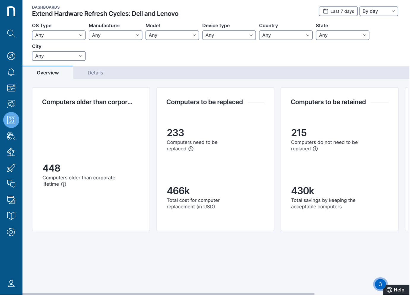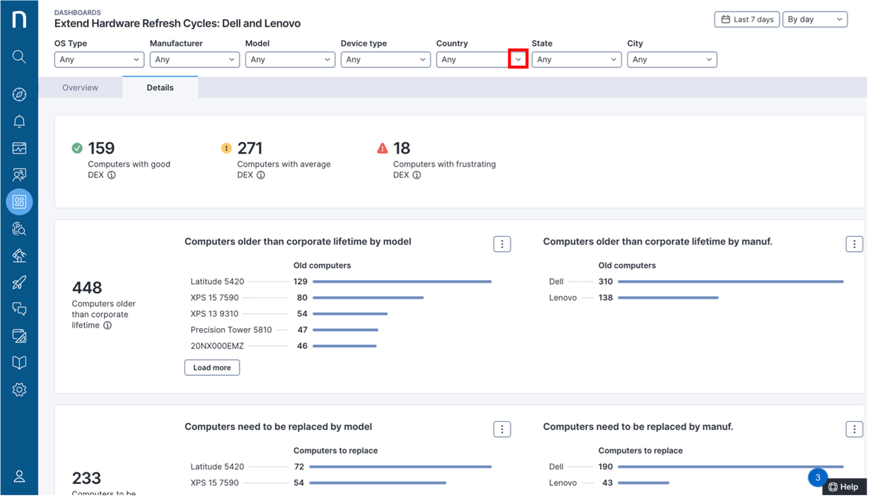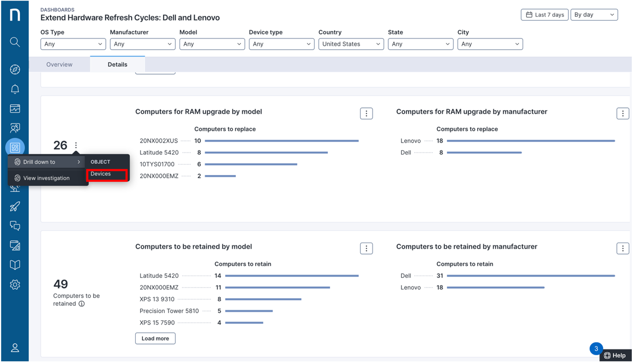 Step 4 : This live dashboard, like all Nexthink dashboards, is easy to use with a range of filters to analyze data granulally. This dashboard is out of the box and can be configured as needed. In this view, you can see different categories of devices for which replacement, retention or upgrade is recommended.