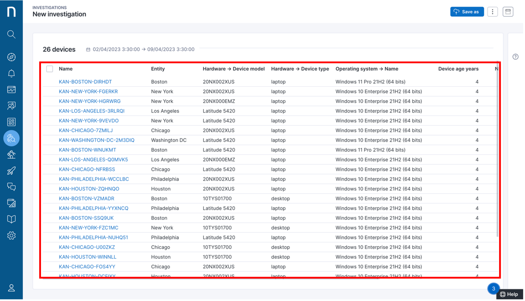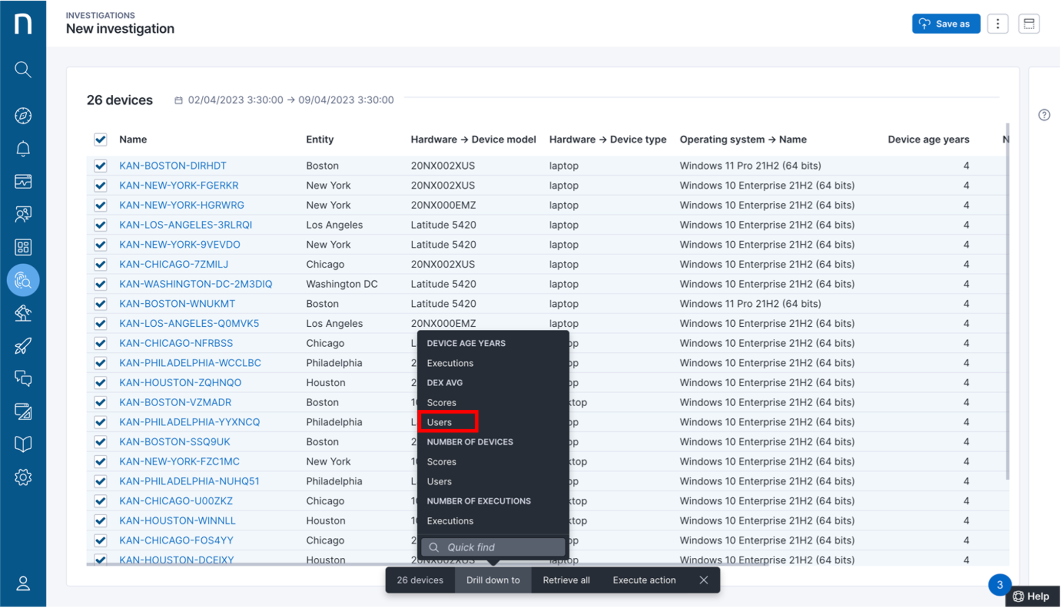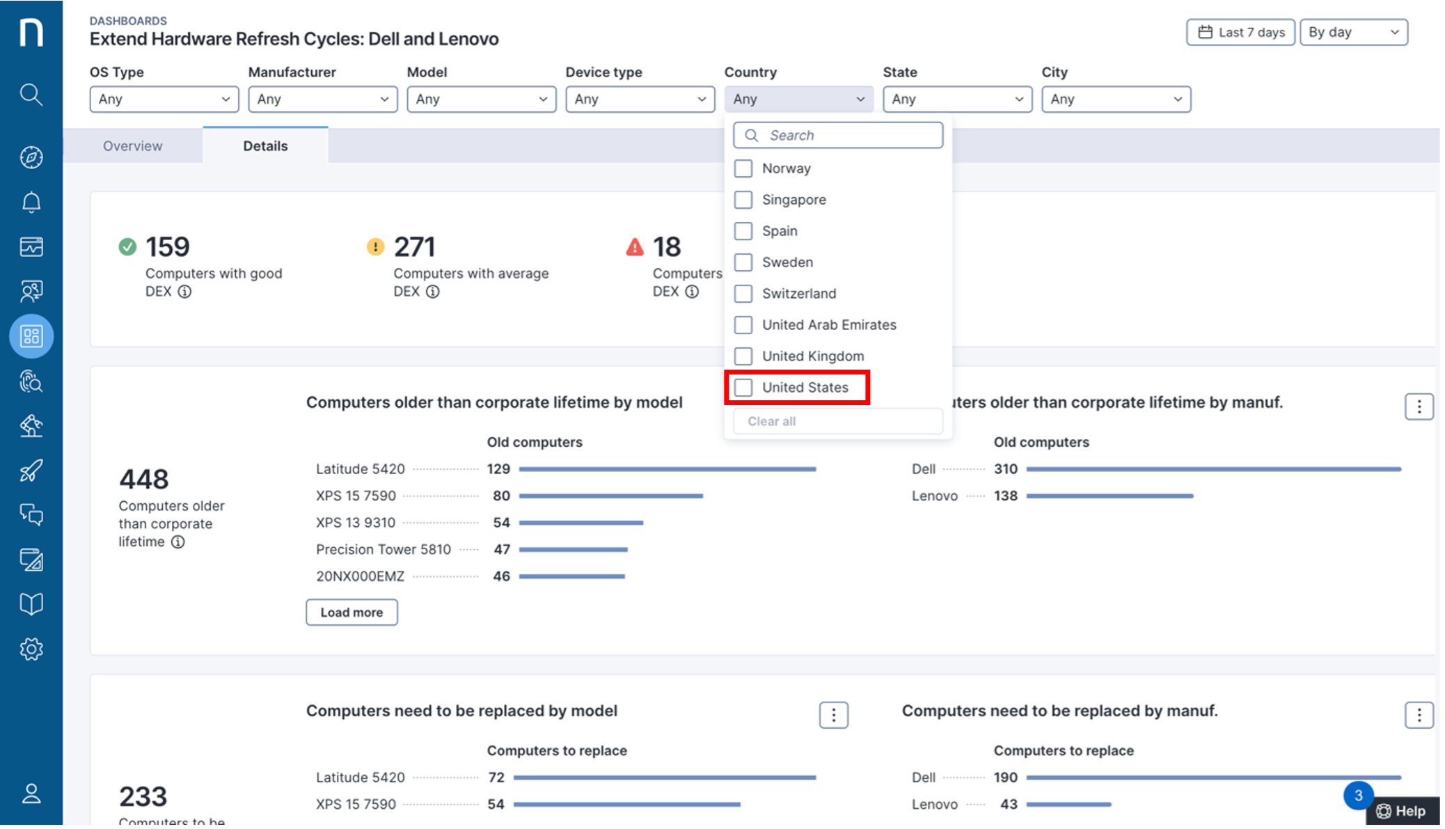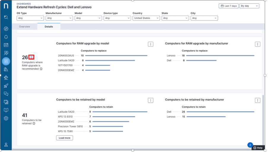 Step 4 : This live dashboard, like all Nexthink dashboards, is easy to use with a range of filters to analyze data granulally. This dashboard is out of the box and can be configured as needed. In this view, you can see different categories of devices for which replacement, retention or upgrade is recommended.