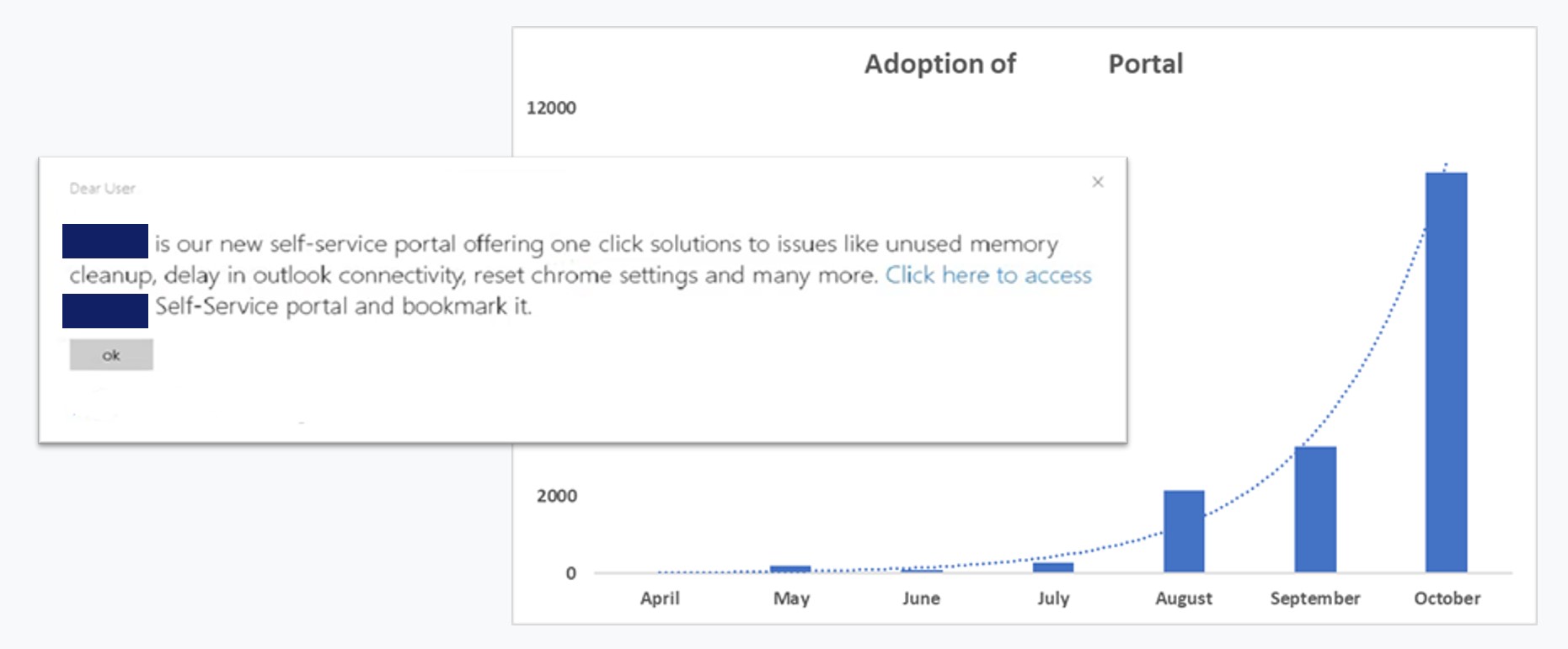 To accelerate the adoption of this new system, a Nexthink Engage awareness campaign was sent to every user in the organization. A short while later, using Nexthink analytics, a second campaign targeted users who still had not visited the portal. By October, the IT team observed a 300% increase in self-help tickets, with a 60% reduction in tickets impacting support agents.
