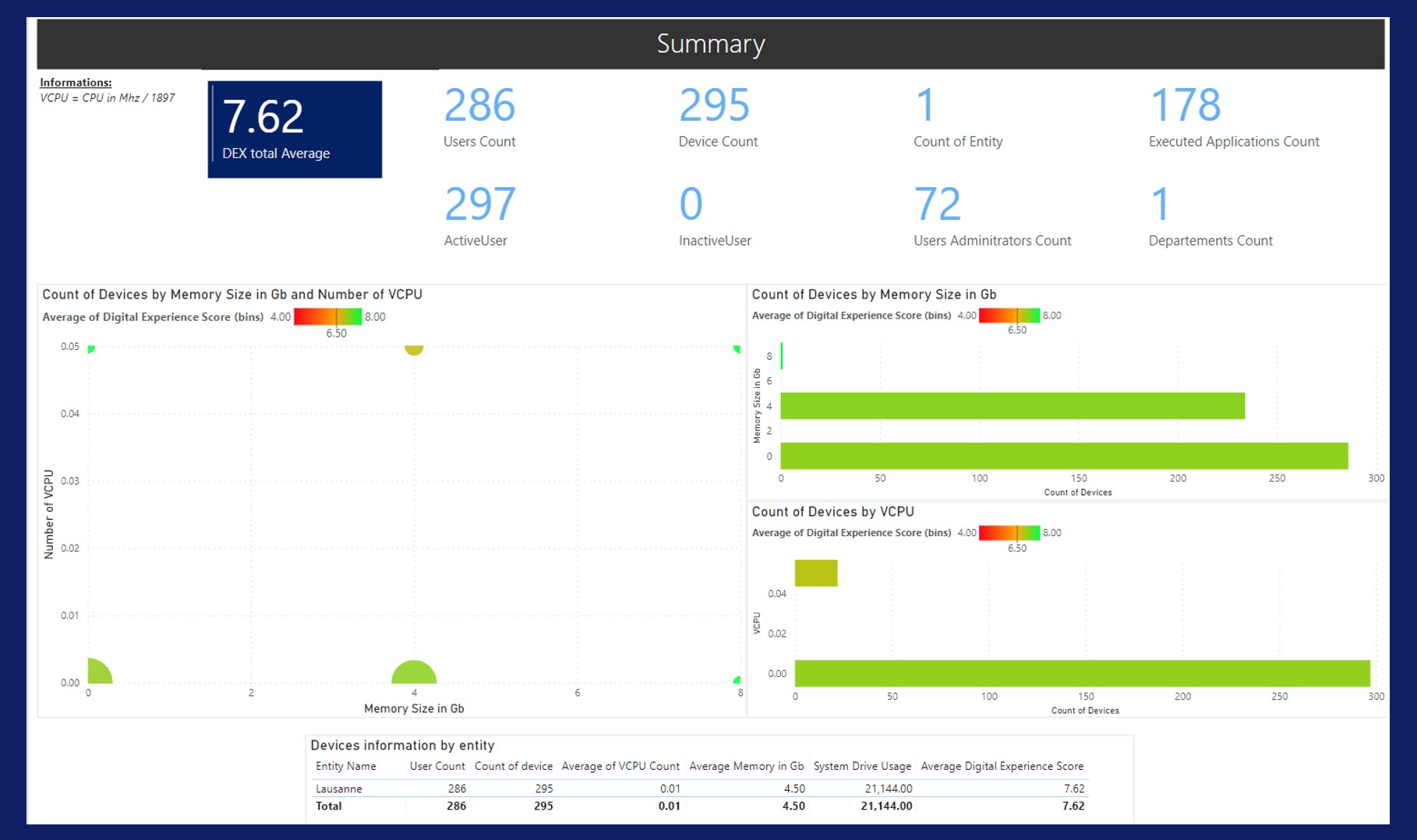 A summary dashboard provided a simple overview of their targeting landscape, providing a realistic sizing matching with realistic employee experience expectations. They could then drill down into users’ real infrastructure usage and activities to quickly identify the source of poor experiences. A dynamic filtering system allowed them to focus on specific user, application and/or device groups.