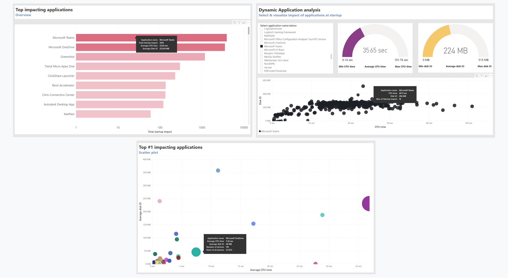 An overview dashboard weighs the impact of each application across all devices and rates them accordingly. A dynamic view then allows IT to filter through different applications for more details on their effect on CPU and disk. A third view displays the top impacting application and amount of impacted device on a scatter graph.