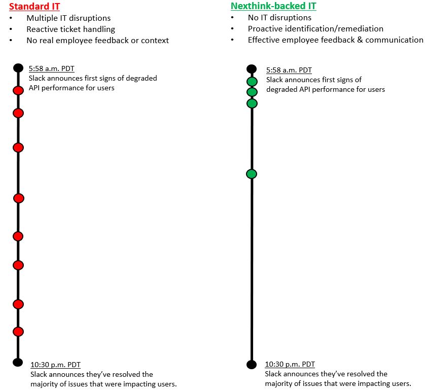 While Slack’s support team worked feverishly in the background to resolve their internal issues, I’m certain two very different timelines emerged that day for the typical IT department versus a Nexthink-backed IT department.