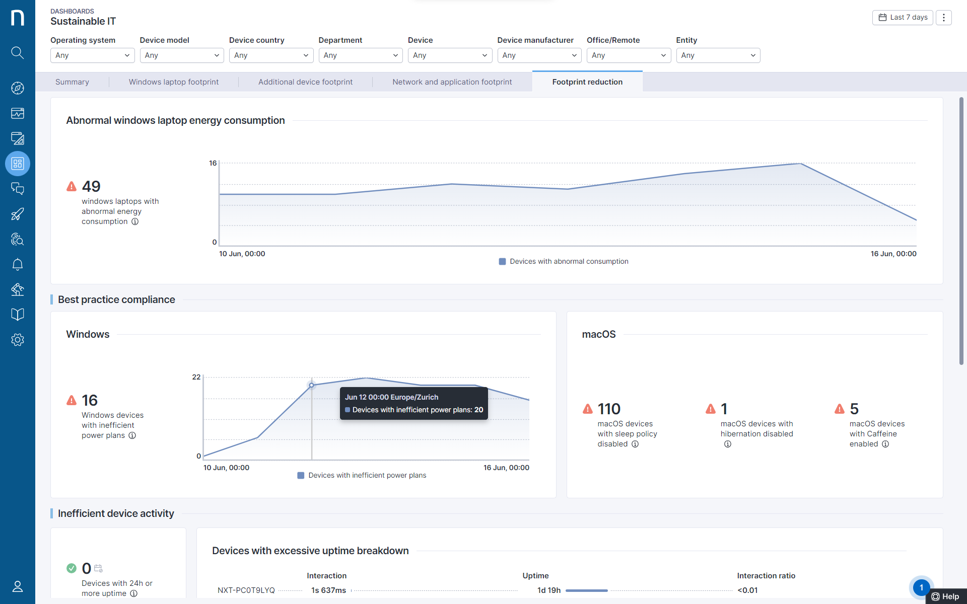 Identifying inefficient, abnormal, and unnecessary consumption is the fastest way to cut down energy and reduce costs. We’re excited to introduce several new features that help identify abnormal consumption patterns, allowing you to take action on energy-intensive devices or processes. And with best practice compliance insights, including Windows power plan recommendations and macOS “always on” app awareness, you can ensure that devices are set for maximum energy efficiency. Additionally, you can identify devices running unnecessarily and inactive servers, both of which contribute to energy waste.