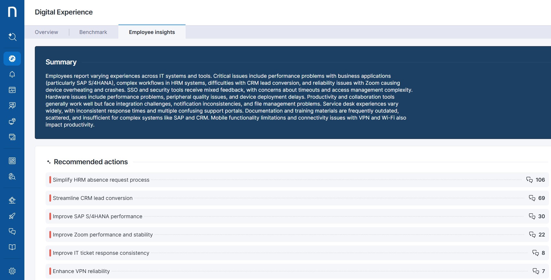 This dashboard provides a fast, high-level understanding of employee experience, alongside recommended actions grounded in feedback. Summaries and actions can be filtered by persona, department, app usage, device type, and more - making the insights both powerful and highly contextual.