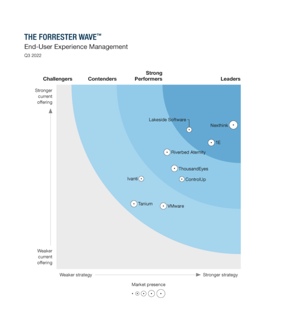 Vous trouverez les réponses à ces questions dans le dernier rapport Forrester Wave™️ : End-User Experience Management, Q3 2022 (publié en août 2022). Grand nom des études et analyses de marché dans l'industrie de la tech, Forrester passe au crible l'offre et la stratégie des principaux acteurs de l'EUEM pour en dresser un tableau comparatif.