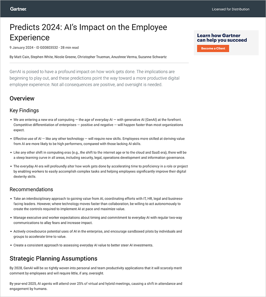 Gartner, Predicts 2024: AI’s Impact on the Employee Experience, Matt Cain, Stephen White, and 4 more, 9 January 2024